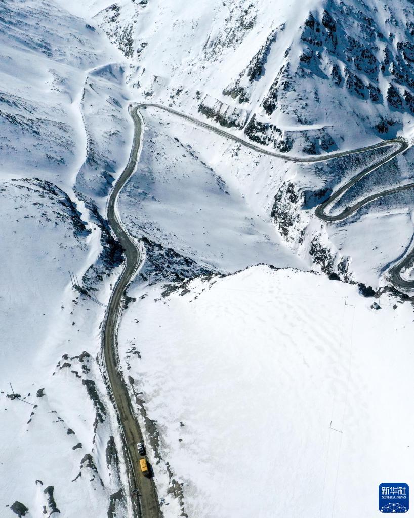 返校学生乘坐的校车翻越盖家克达坂(2月25日摄,无人机照片)。