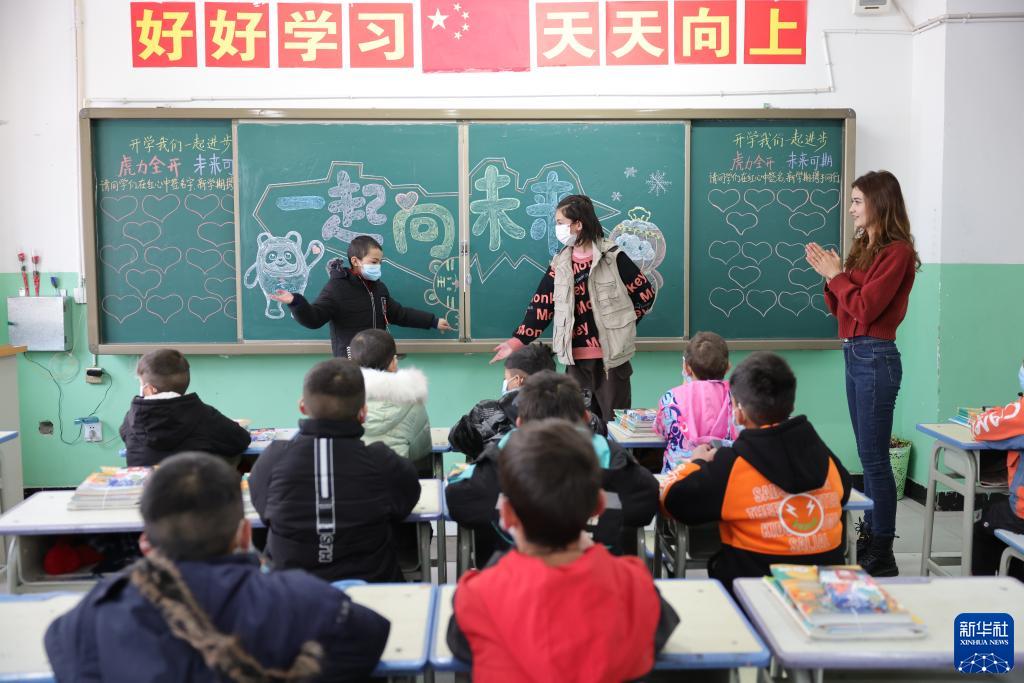 在新疆塔什库尔干塔吉克自治县城乡寄宿制小学,阿衣扎玛丽·米尔扎江(上左)和同学们一起上开学第一课(2月26日摄)。