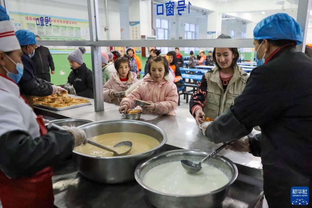 在新疆塔什库尔干塔吉克自治县城乡寄宿制小学,学生在食堂领取免费早餐(2月26日摄)。