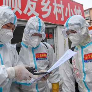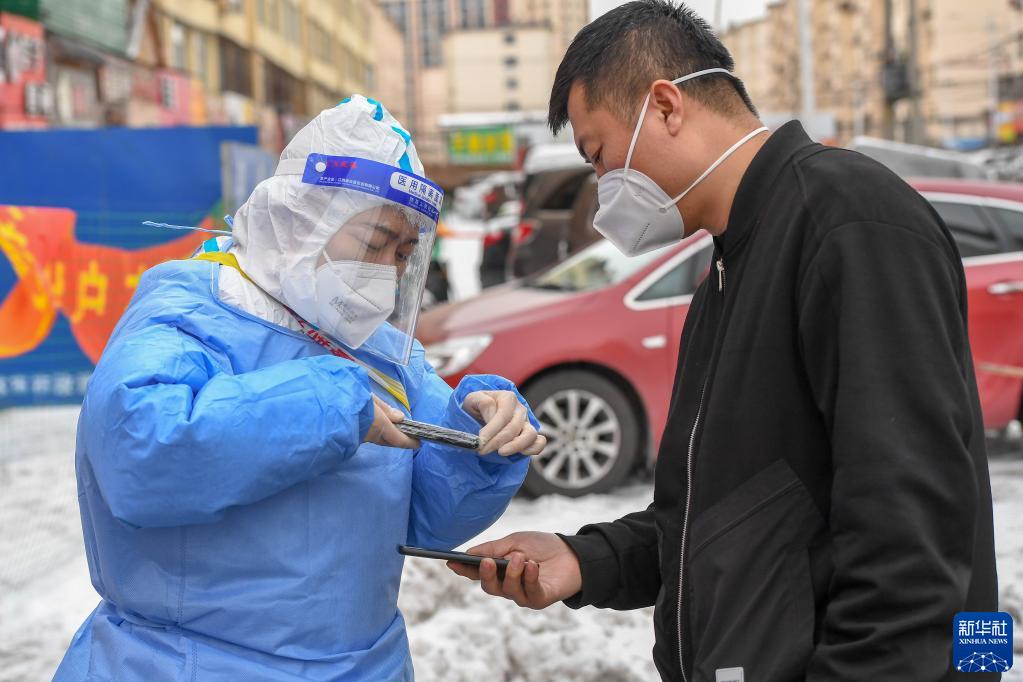 3月18日,吉林市党员志愿者张骞文(左)在社区核酸检测采样点为居民扫码登记。