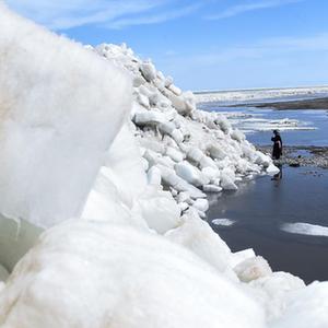 3月19日,在青海湖边,一位当地牧民在拍摄堆积在岸边的湖冰。