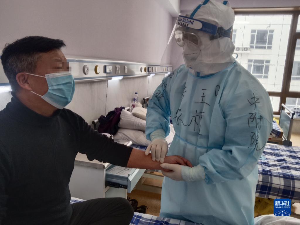 3月18日,长春中医药大学附属医院教授王檀在长春通源方舱医院为新冠肺炎轻症患者把脉。