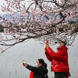 3月19日,颐和园西堤的山桃花与佛香阁相映成景。