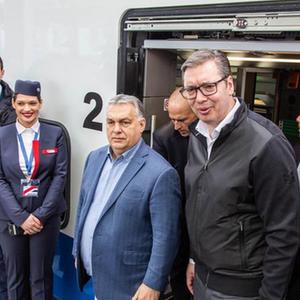 3月19日,在塞尔维亚诺维萨德,塞尔维亚总统武契奇(右)和匈牙利总理欧尔班出席开通仪式。
