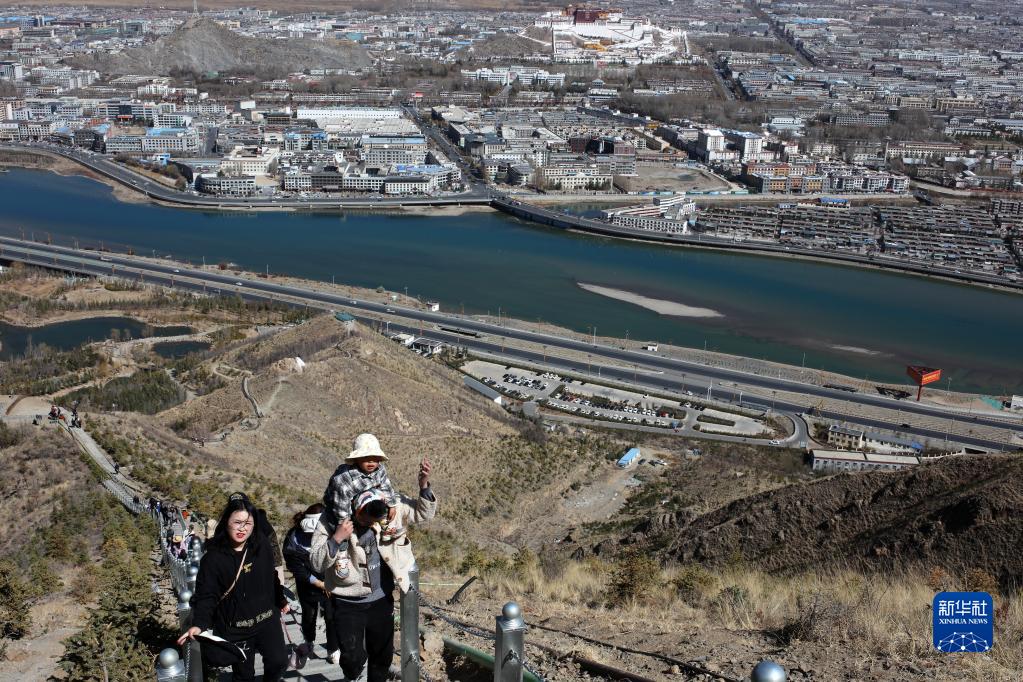 3月19日,游客在西藏拉萨市南山公园爬山。