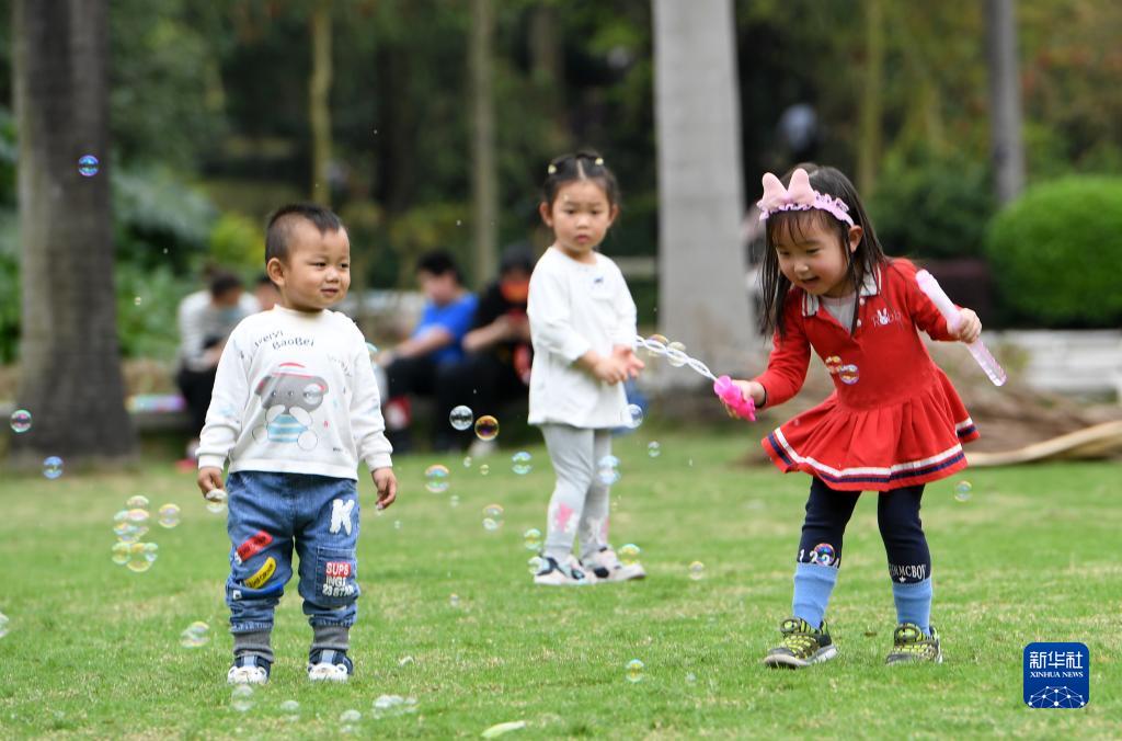 3月20日,小朋友在广西南宁市金花茶公园玩耍。