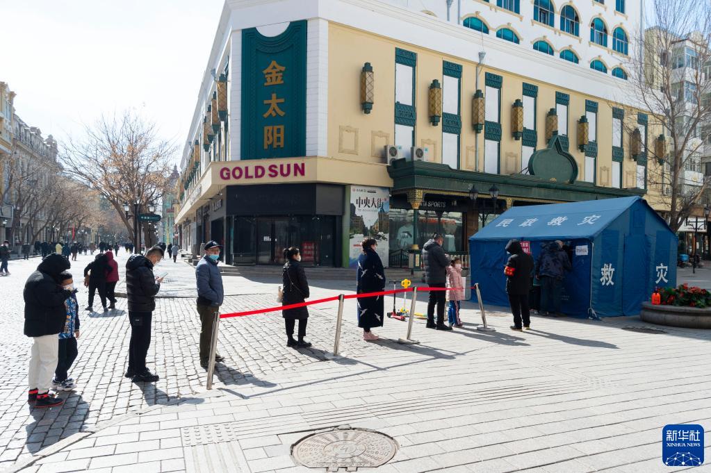 3月20日,在哈尔滨市道里区一处核酸检测采样点,市民排队等待核酸采样。