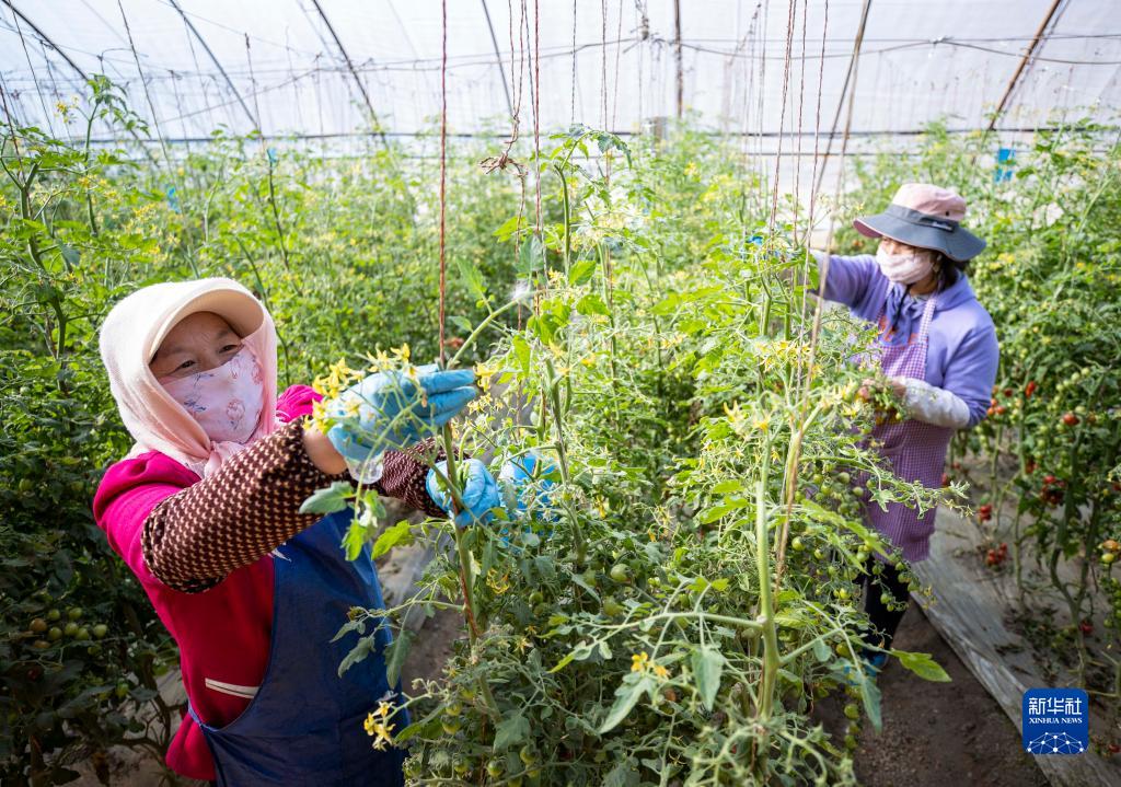 3月20日,在宁夏银川市贺兰县习岗镇新平设施农业园区瑞信果蔬农庄温棚内,农民为小番茄打叉。