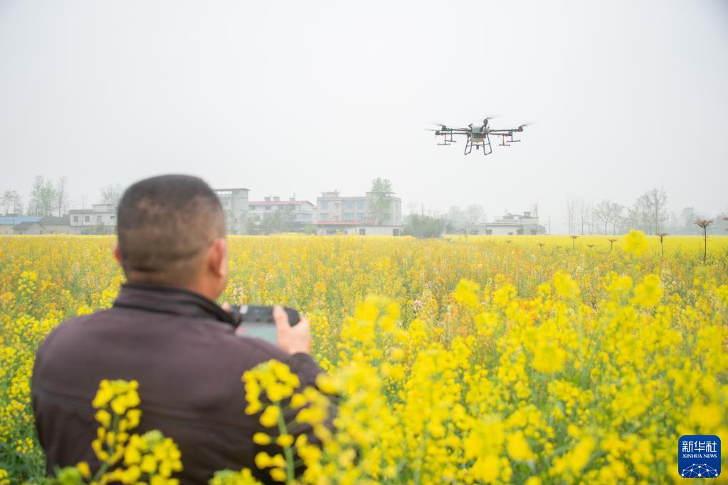 3月20日,在湖北省崇阳县青山镇的为民农机专业合作社,农民在田间操控无人机作业。