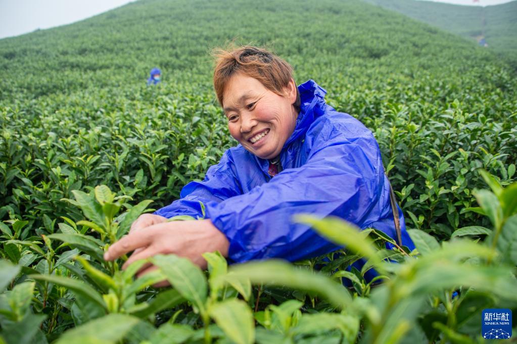3月20日,在湖北省崇阳县青山镇的青岗白茶基地,工人在采摘茶叶。