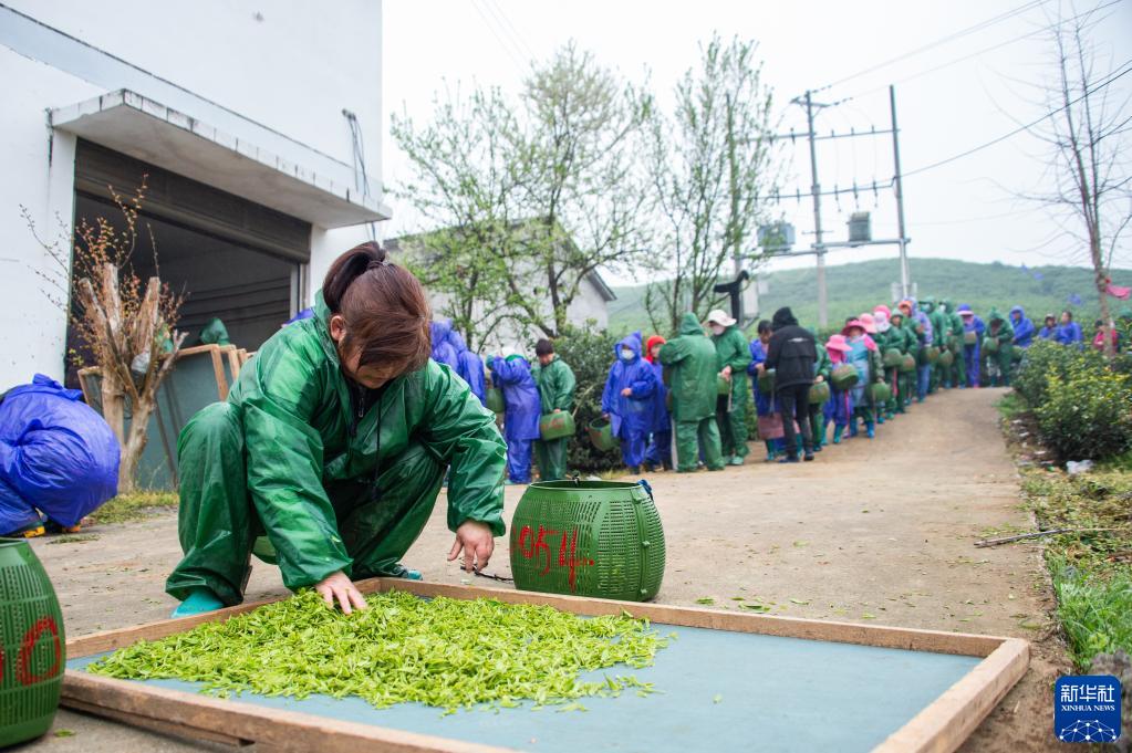 3月20日,在湖北省崇阳县青山镇的青岗白茶基地,工人在处理茶叶。