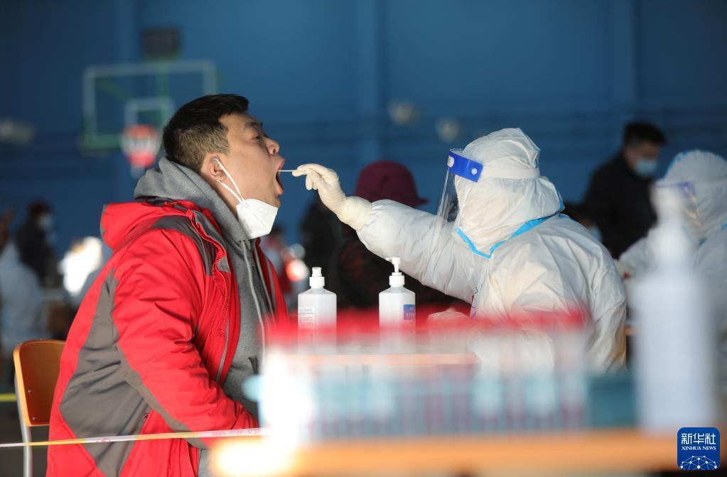 3月19日,在沈阳市和平区126中学长白岛校区核酸检测点,工作人员为一名市民进行核酸采样。
