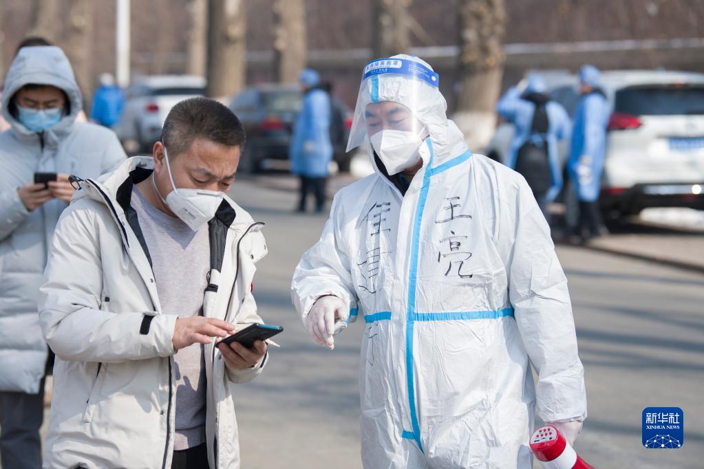 3月21日,防疫志愿者帮助接受核酸采样的居民进行信息登记。