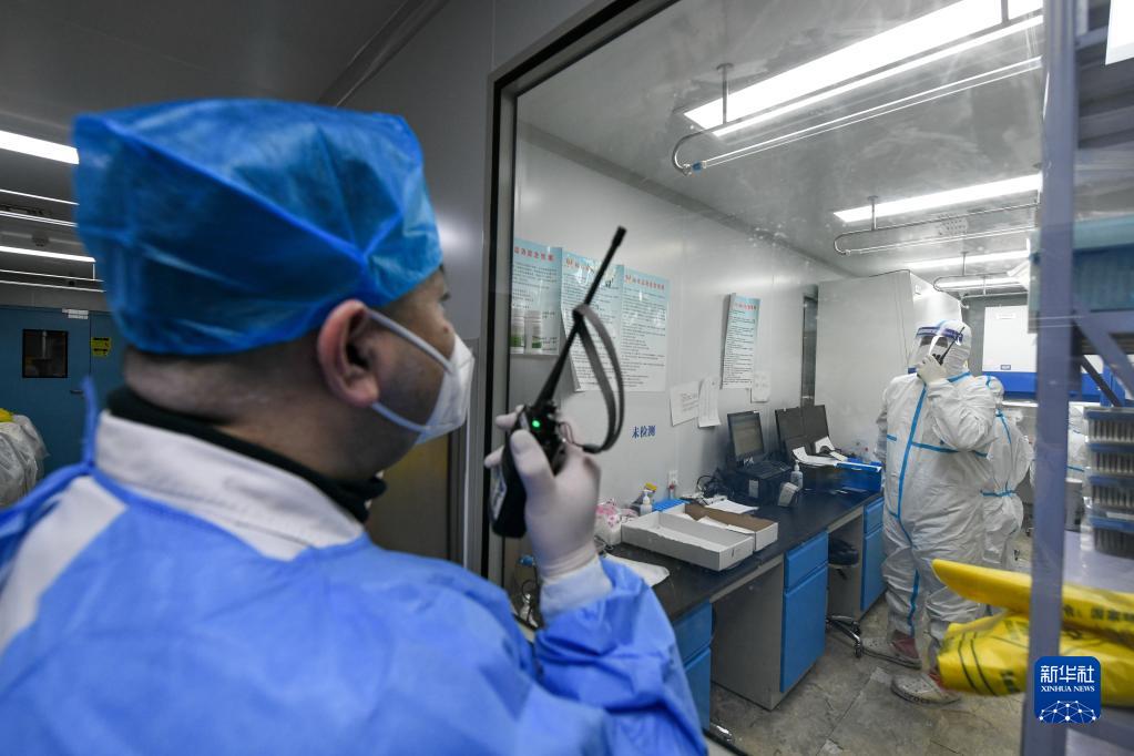 3月19日,在天津市河北区城市核酸检测基地内,耿田(左)通过对讲机与实验室内的工作人员沟通。