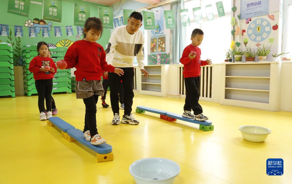 3月21日,河北省邢台市襄都区豫办实验幼儿园教师带领小朋友做节水护水游戏。