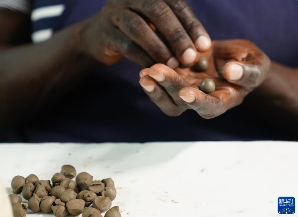 3月21日,一名女员工在肯尼亚内罗毕Kazuri手工作坊用陶土制作珠子。