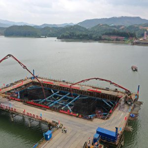 当日,在广西上林至横州高速公路建设施工现场,工人们加班加点完成控制性工程——西津郁江特大桥水中承台的浇筑作业。