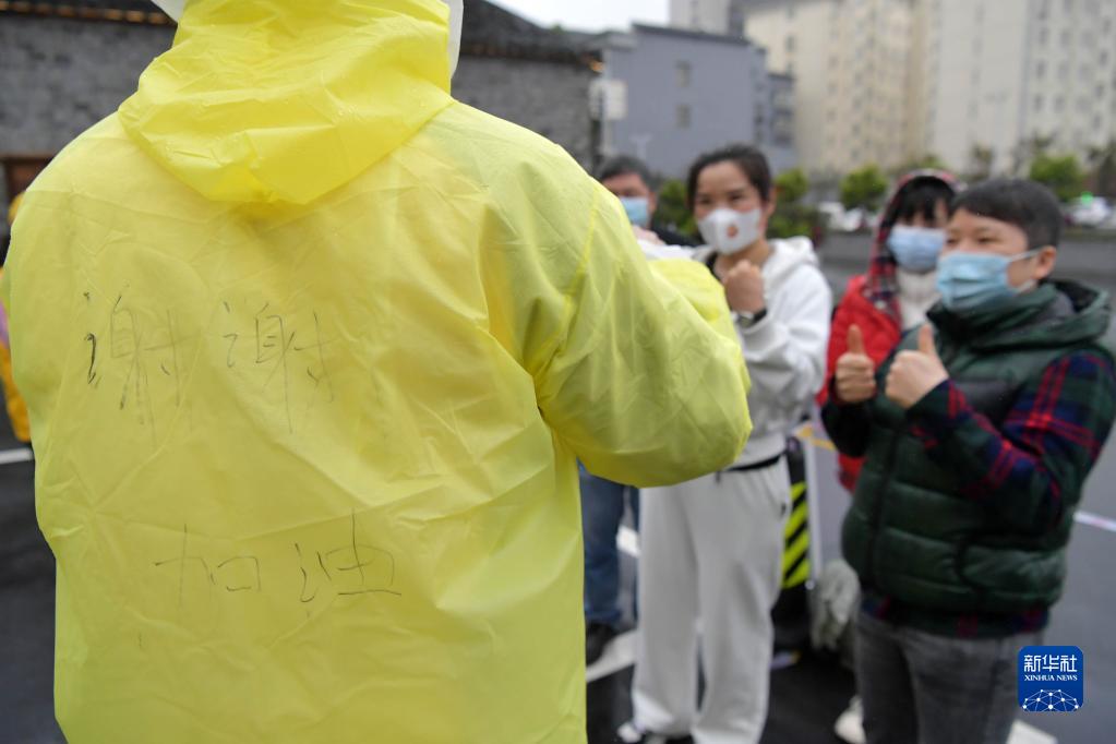 在南昌市东湖区滕王阁广场核酸检测点,几名刚顺利做完核酸检测的听障人士在李焕秋的背上写下了“谢谢,加油”的字样(3月21日摄)。