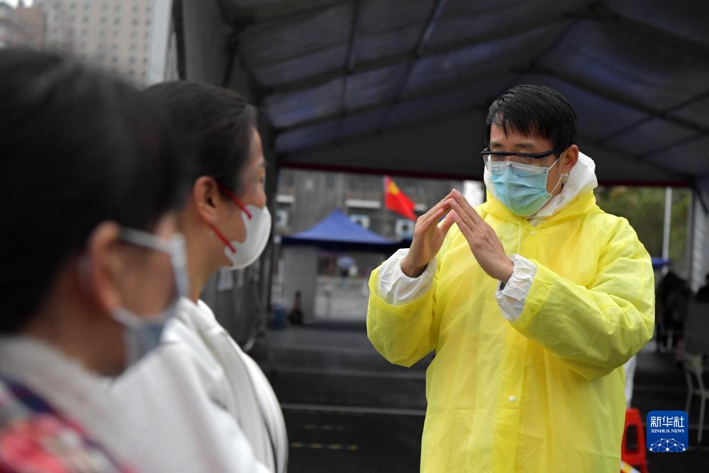 在南昌市东湖区滕王阁广场核酸检测点,志愿者李焕秋向听障人士介绍居家隔离需要注意的事项(3月21日摄)。
