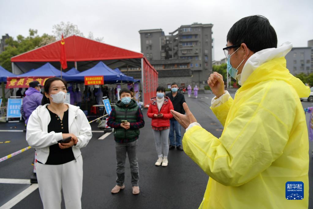 在南昌市东湖区滕王阁广场核酸检测点,志愿者李焕秋(右一)用手语向听障人士介绍做核酸检测需要注意的事项(3月21日摄)。