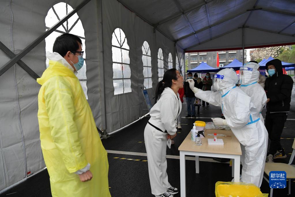 在南昌市东湖区滕王阁广场核酸检测点,几名听障人士在做核酸检测(3月21日摄)。