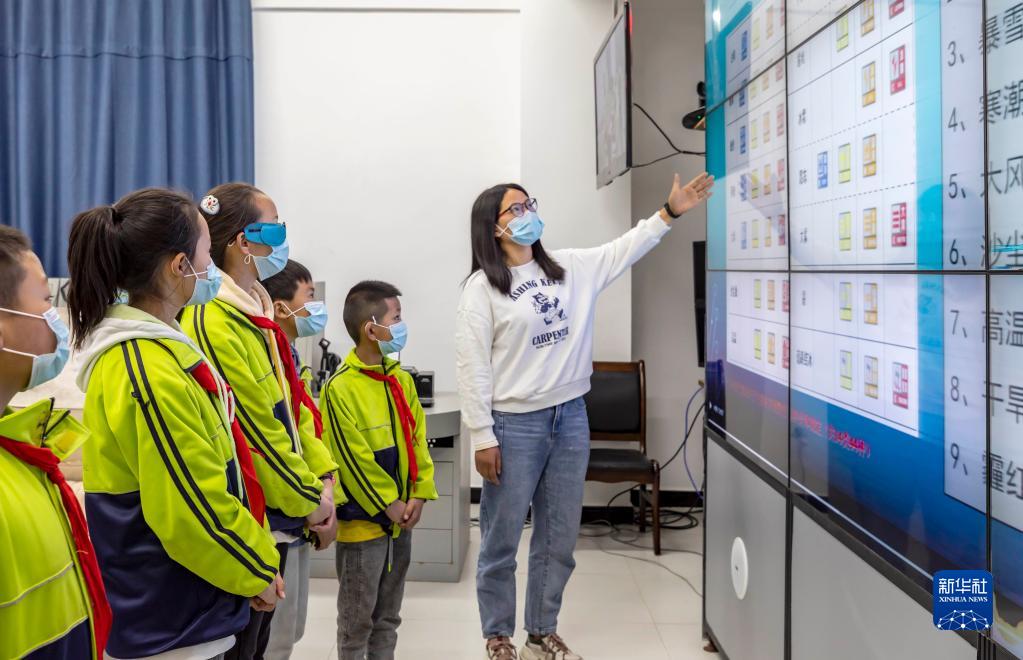 3月22日,学生在贵州省黔西市气象局听工作人员讲解气象知识。