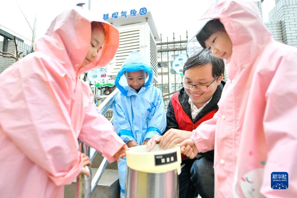 3月22日,在浙江省湖州市长兴县开发区实验幼儿园,孩子们在气象科普志愿者指导下通过雨量筒观测降水量。