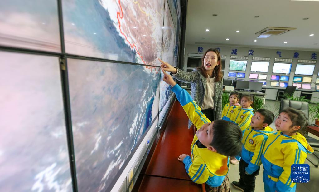 3月22日,工作人员在贵州省铜仁市玉屏侗族自治县气象局向小朋友介绍气象知识。