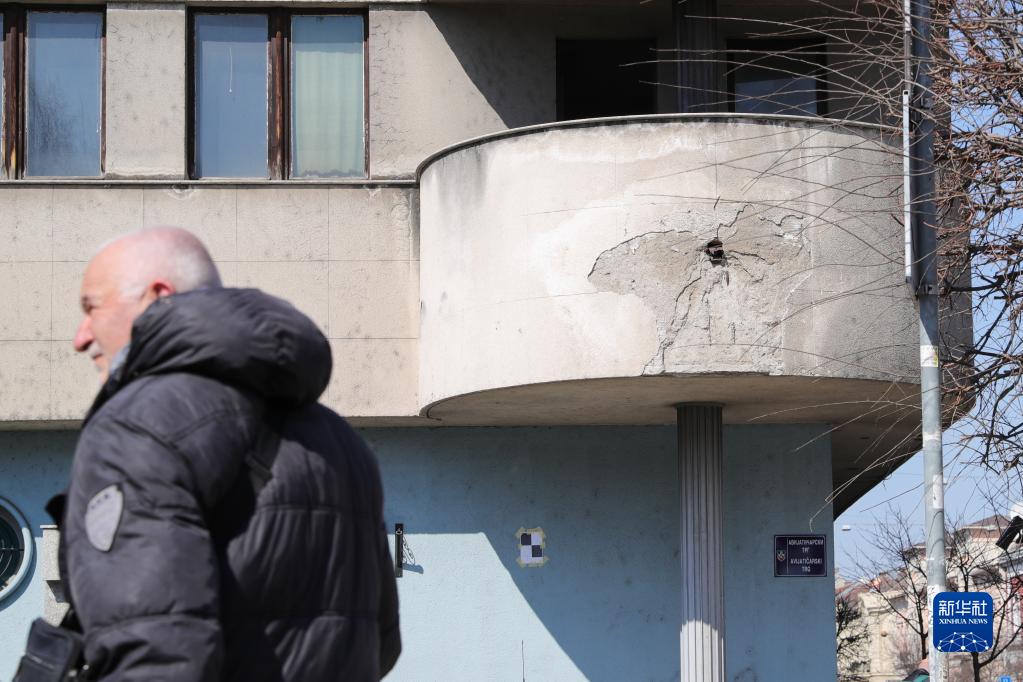 3月21日,行人经过塞尔维亚贝尔格莱德曾经遭受北约空袭的南斯拉夫空军司令部大厦。