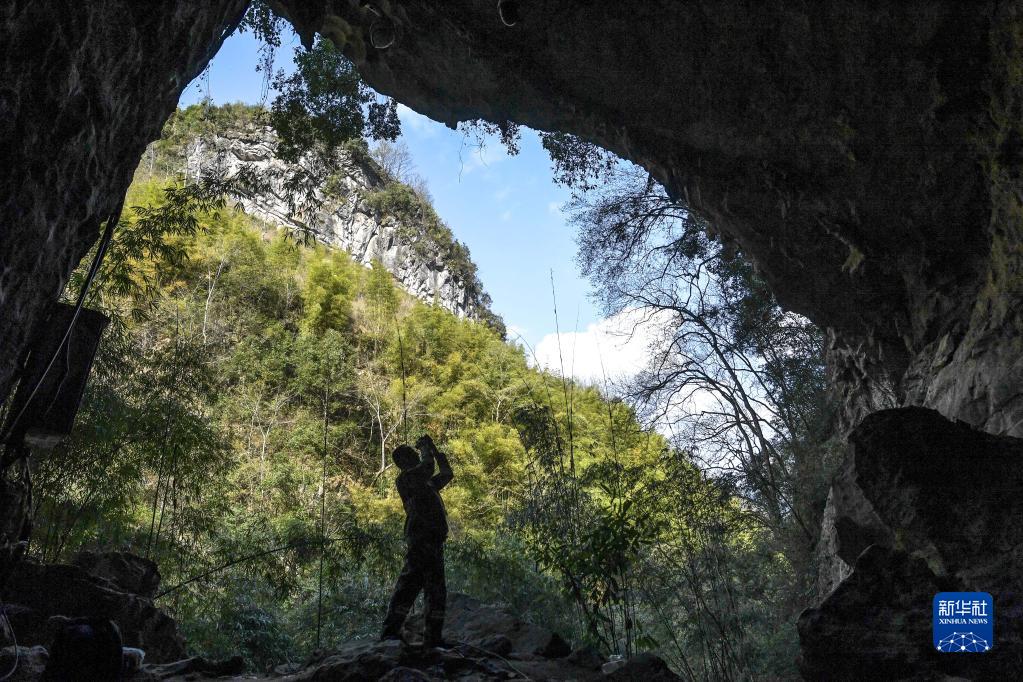 肖治金在黑叶猴群栖息的一处山洞观察猴群活动轨迹(3月17日摄)。