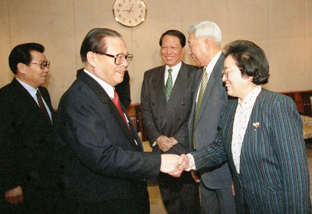 1997年1月1日,江泽民同志在北京会见民革中央新任主席何鲁丽同志。新华社记者 刘建生 摄