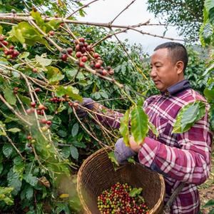 80岁的高级农艺师廖秀桂(左一)在云南普洱市思茅区小凹子咖啡庄园内向两名游客做介绍(2月22日摄)。
