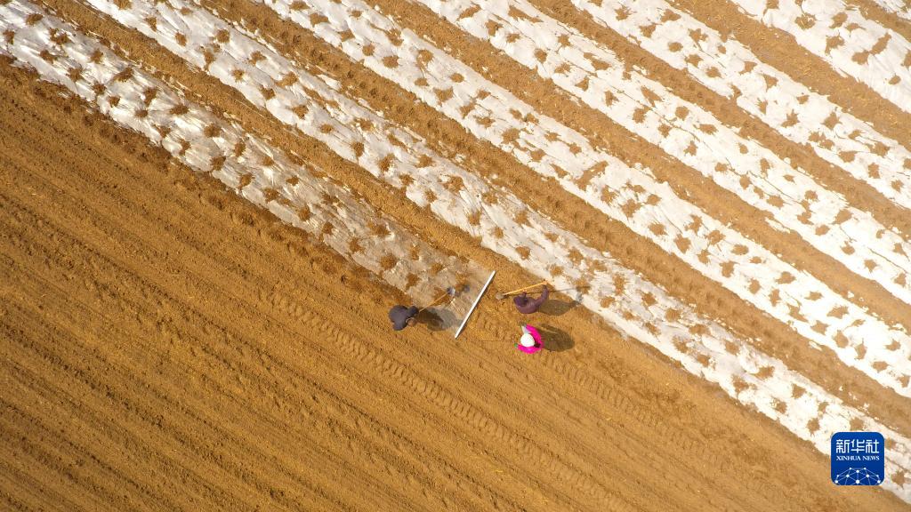 3月23日,山东省聊城市茌平区贾寨镇前付村村民在田间给种植的花生覆盖地膜(无人机照片)。