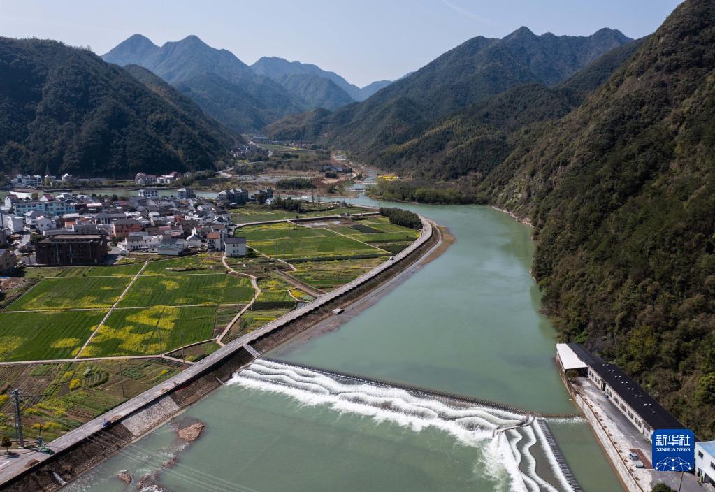 空中俯瞰湖源乡壶源溪梅州坝(3月24日摄,无人机照片)。