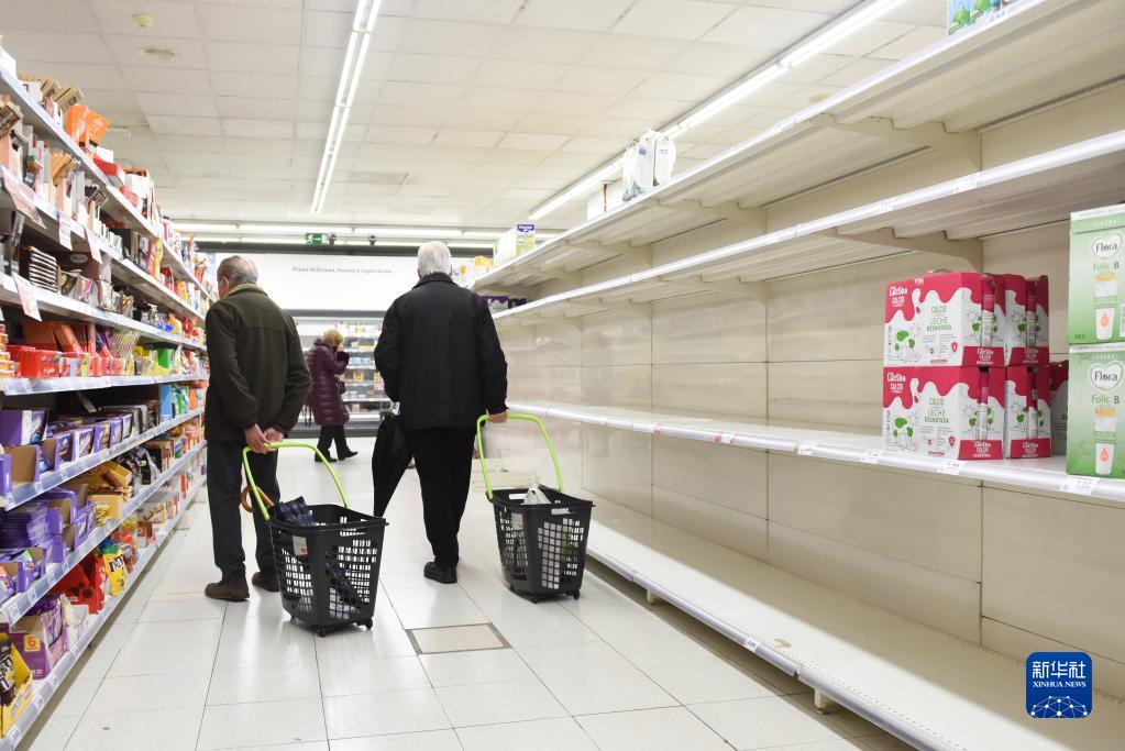 3月23日,人们走过西班牙卡塞雷斯一家超市内空荡荡的奶制品货架。燃油价格上涨已经影响到西班牙部分商品的市场供应。