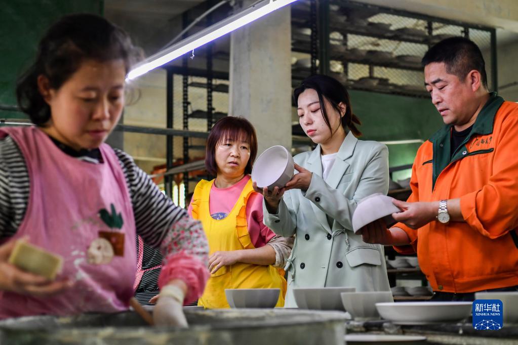 3月24日,在山西省阳城县沙坡村,乔琳(右二)在乔氏珐华日用瓷器生产车间查看产品质量。新华社记者 曹阳 摄