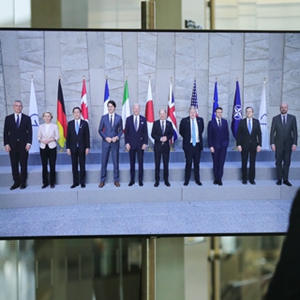3月24日,在比利时布鲁塞尔的北约总部,一名男子观看屏幕上美国总统拜登(右四)、欧盟委员会主席冯德莱恩(右三)、加拿大总理特鲁多(右二)、德国总理朔尔茨(右一)出席七国集团峰会合影仪式的画面。