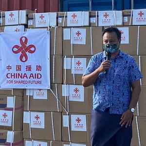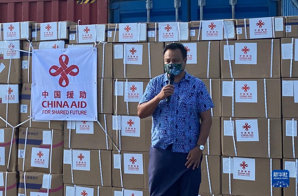 3月24日,在基里巴斯首都塔拉瓦,基里巴斯卫生和医疗服务部长伊廷特昂在物资交接仪式上致辞。基里巴斯政府24日在首都塔拉瓦举行中国援基第二批紧急抗疫物资交接仪式。新华社发(中国驻基里巴斯大使馆供图)
