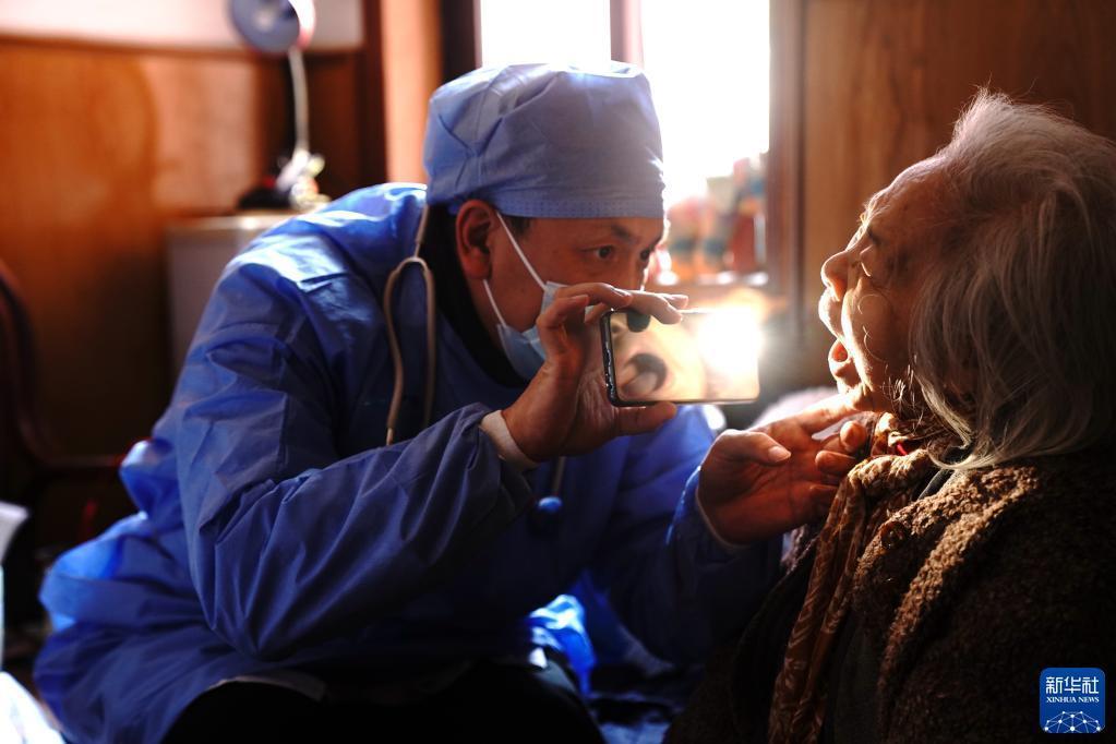 3月24日,上海闵行区古美社区卫生服务中心家庭医生黄鹏宇在平吉一村一名老人家中为她检查牙齿。