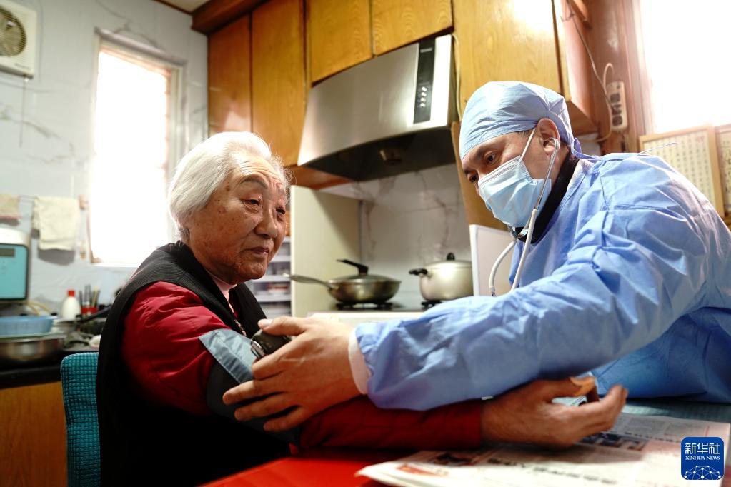 3月24日,上海闵行区古美社区卫生服务中心家庭医生黄鹏宇在平吉一村一名老人家中探访,并为她量血压。
