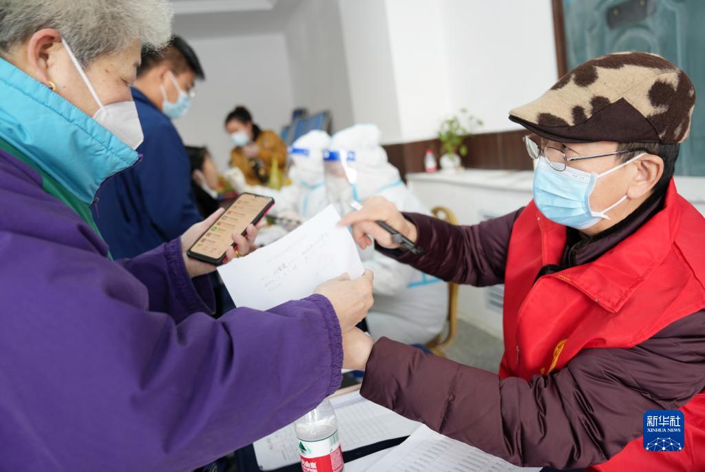 3月25日,在哈尔滨市衡山路上的一处免费核酸采样点,志愿者(右)在为市民服务。新华社记者 王建威 摄