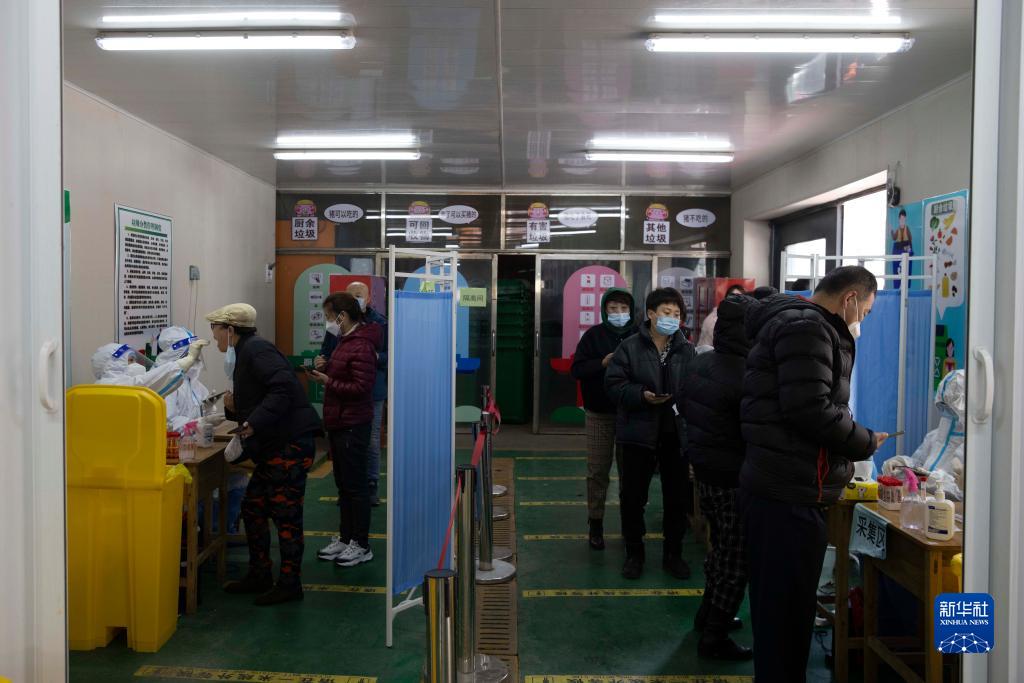 3月25日,在哈尔滨市香坊区大庆副路上的一处免费核酸采样点,市民在排队登记信息、接受核酸采样。新华社记者 张涛 摄