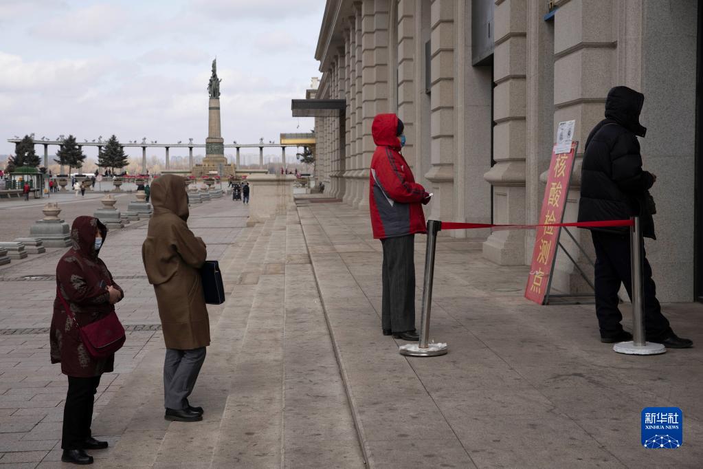 3月25日,在哈尔滨市道里区斯大林街道办事处免费核酸采样点,市民排队等候核酸采样。新华社记者 张涛 摄