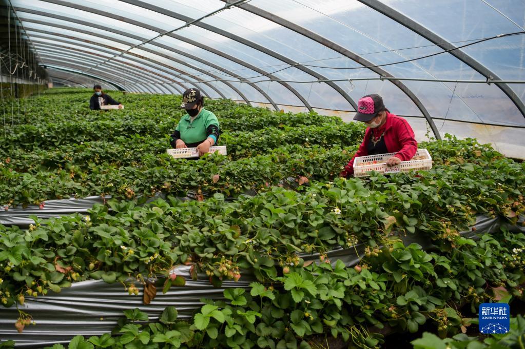 3月25日,在位于新城区讨思浩村的百鲜现代农业园区,村民在采收草莓。