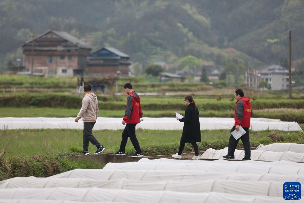 3月24日,在三江侗族自治县良口乡南寨村,纪检监察干部(左一、左三)和驻村工作队员走在田间,准备开展监督检查。