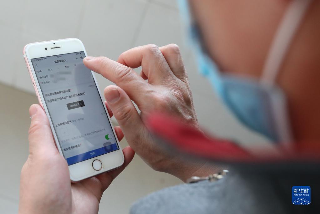 患者家属在贵州省人民医院通过“云诊疗”系统在线提问(2020年4月16日摄)。