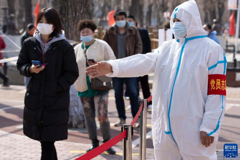 3月26日,在哈尔滨市道里区建国街道办事处核酸检测点,工作人员指引市民排队接受核酸检测。