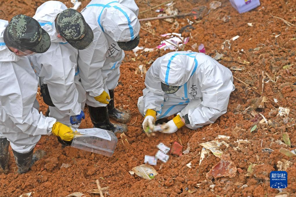 3月26日,搜救人员在事故核心现场查看找到的卡包。当日,在东航MU5735客机坠毁事故核心现场,搜救人员展开拉网式搜索。 新华社记者 周华 摄