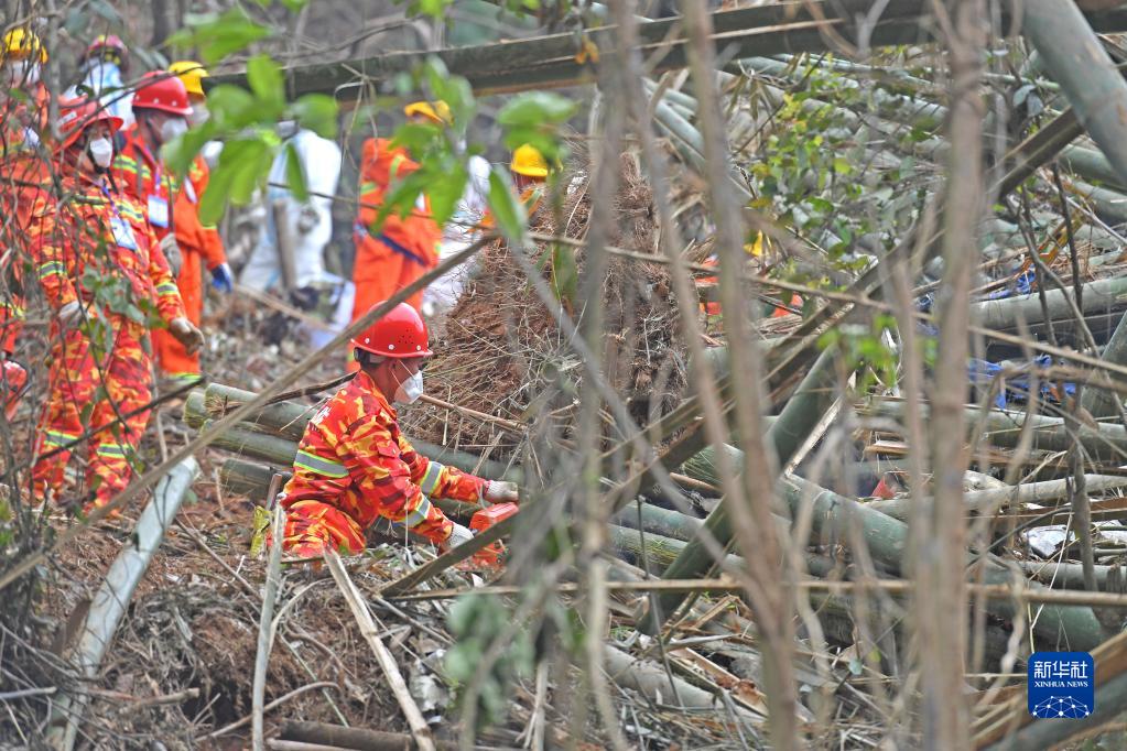 3月26日,搜救人员在事故核心现场清理歪倒的竹林。当日,在东航MU5735客机坠毁事故核心现场,搜救人员展开拉网式搜索。新华社记者 周华 摄