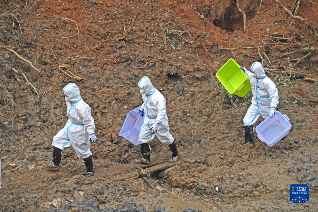 3月26日,搜救人员在事故核心现场搬运盛装物品的箱子。当日,在东航MU5735客机坠毁事故核心现场,搜救人员展开拉网式搜索。新华社记者 周华 摄